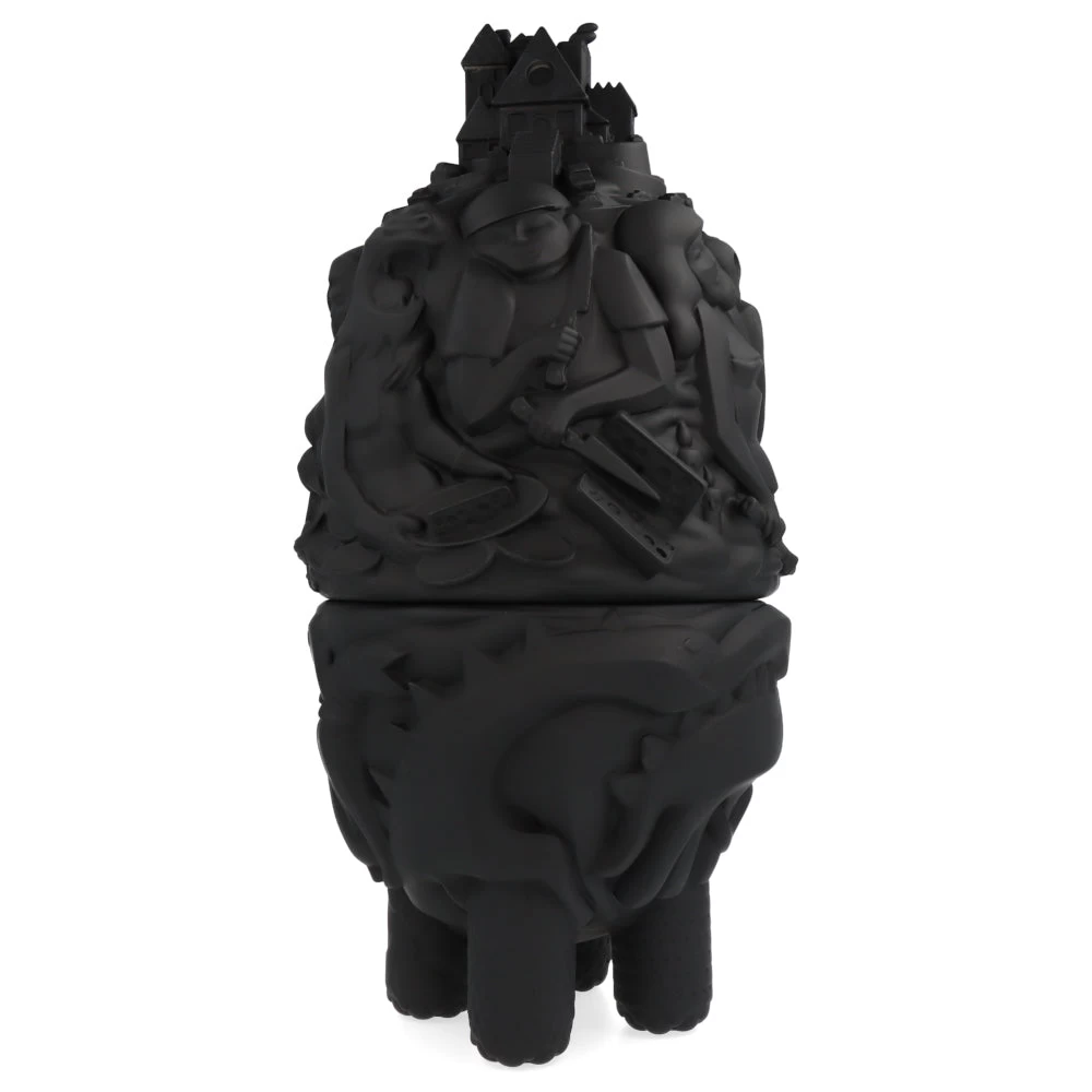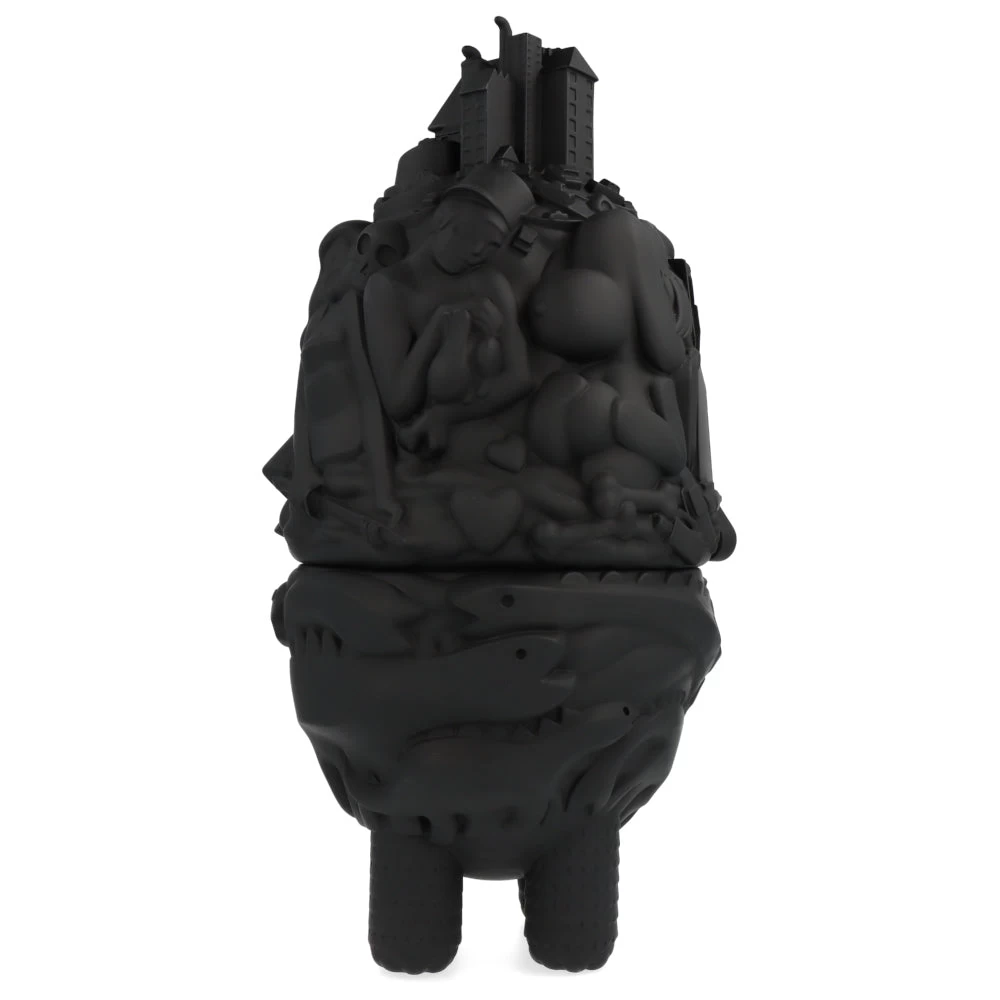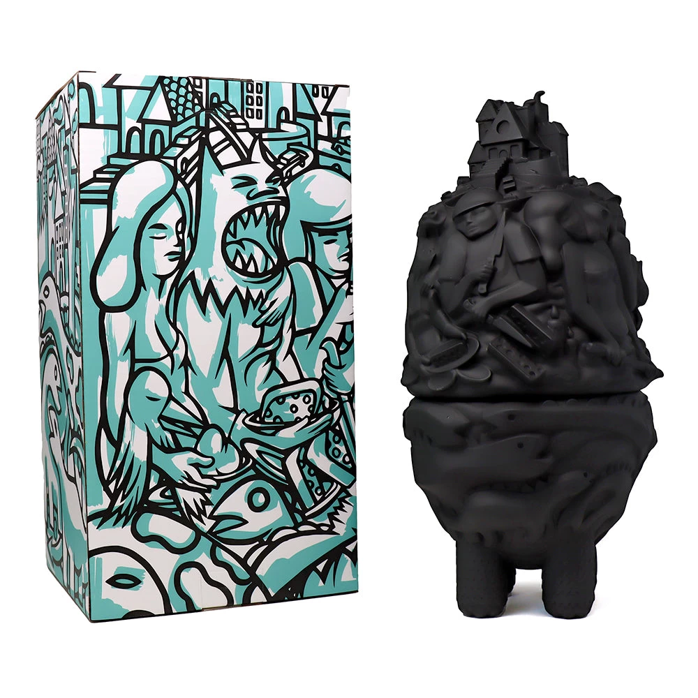 Haute de 40 cm, cette ville monstrueuse prend ici la forme d’une figurine/boite en deux parties. À mi-chemin entre le château ambulant et une œuvre de Picasso, cette City Monster Toybox est ici proposé dans sa version noire (une version blanche est aussi disponible sur notre site.) et est limitée à 100 exemplaires.