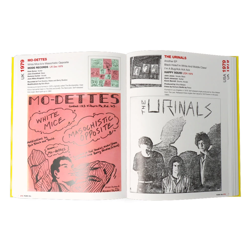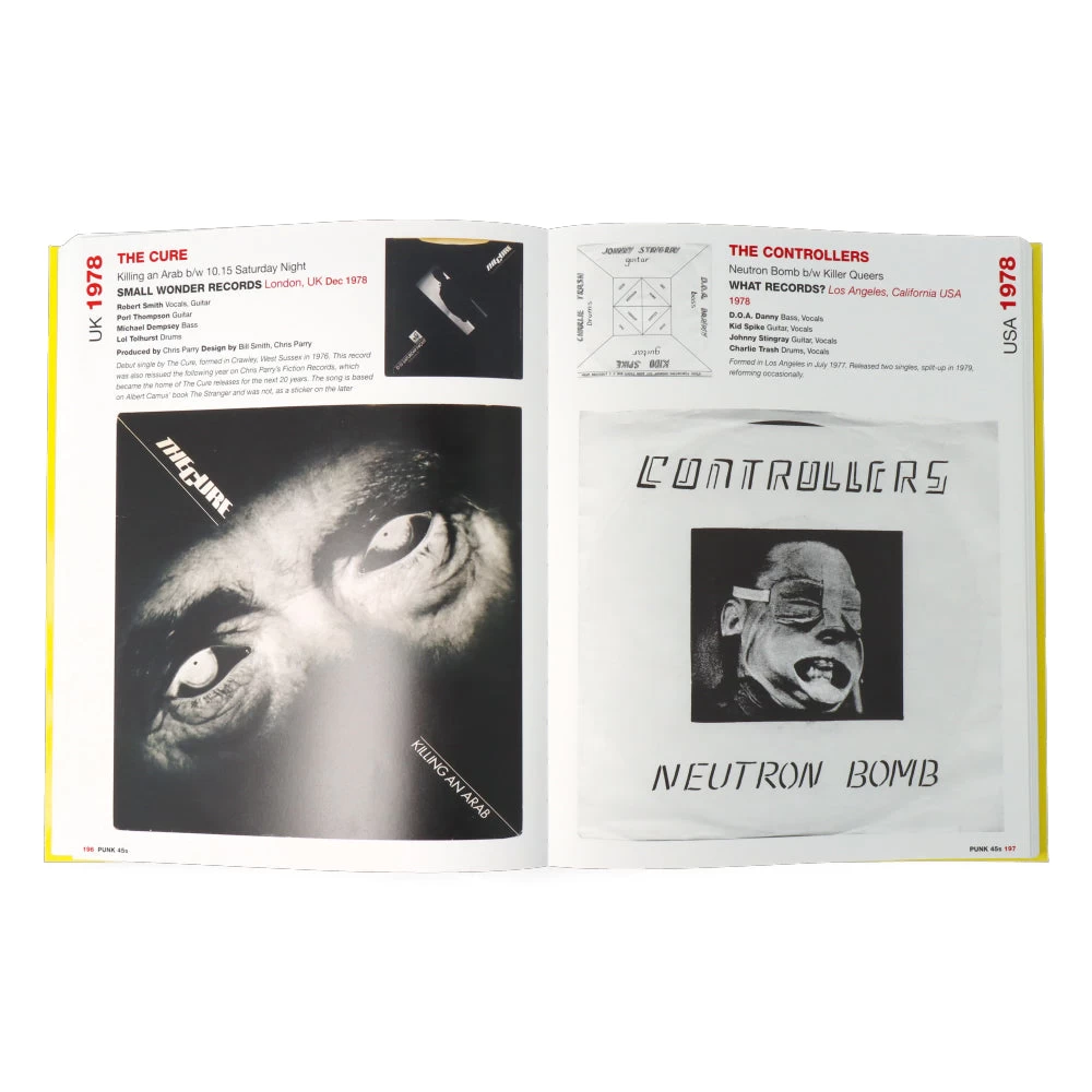 L’ouvrage débute par une introduction de Jon Savage, légendaire biographe des Sex Pistols, à l’histoire de la culture visuelle punk, illustrée par quelques centaines de pochettes d’albums. Si l’angle est chronologique, Punk 45 (Nouvelle édition) explore l’onde de choc internationale que fut le mouvement punk, avec des groupes américains, européens et australiens. Les légendaires The Stooges et Patti Smith côtoient ainsi The Valves (écosse) ou Marie et les garçons (France).